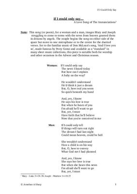 This song (or poem), for a woman and a man, images Mary and Joseph struggling to come to terms with the news from heaven granted them in dreams by angels.