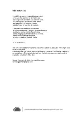 This hymn is based on a traditional prayer for Easter Eve, also used in the night-time office of Compline. Compline is the final church service (or office) of the day in the Christian tradition of canonical hours. The name is derived from the Latin completorium, as Compline marks the completion of the day.