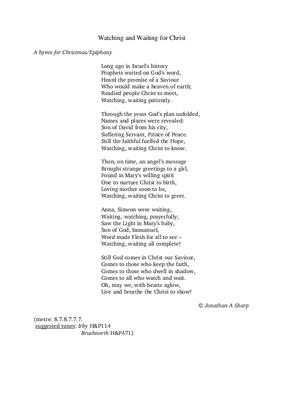 An Epiphany hymn. From prophets' forthtelling, through dreams and angels reaching Mary and Joseph, through the lifelong devotion of Simeon and Anna ... and now it is over to us. Sung to a choice of familiar tunes.