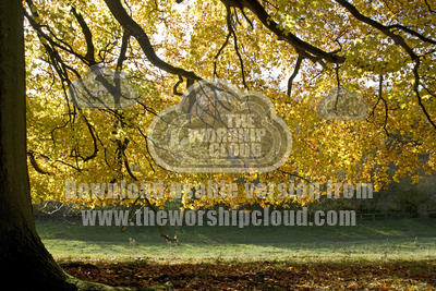 Backlit beech tree in autumn colours Westonbirt Arboretum Tetbury UK