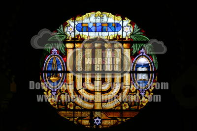 vibrantly coloured stained glass image of candelabra from Jewish Museum