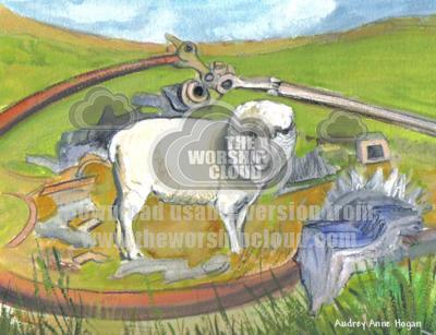 A water colour painting of a sheep standing alone amongst a broken helecopter blade and other pieces of broken metal. This unusual breed of sheep. He looks directly at you questioningly.He seems to be asking "Why have they done this to my lovely Falkland Island"?