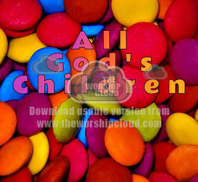 A close-up photo of multi coloured 'Smarties" with the text 'All God's Children"