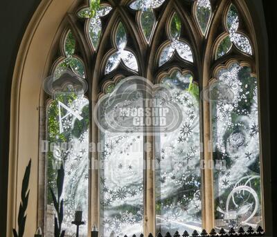 Window at St Nicholas Church Moreton showing the beginning and the end.