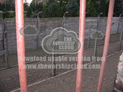 Looking through the bars at the fences around Auschwitz.