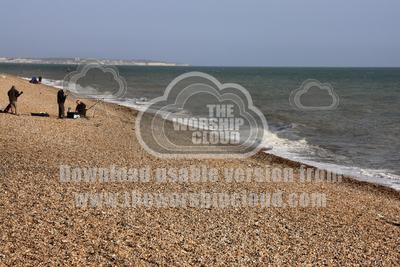 • Two men beach fishing Oxwich Bay Gower South Wales UK