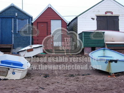 Row of beach houses with boats on sand.