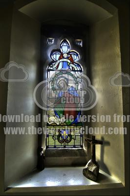 Picture of stained glass window in a church showing the birth of Jesus, with a wooden carving of his crucifixion and a figure of a woman holding spices for his burial placed on the window ledge in front of it.