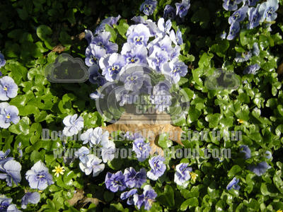 Pretty blue Pansies with bright green leaves growing in a garden.