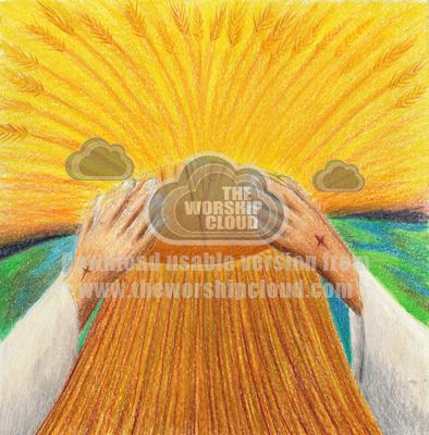The image depicts communion that gathers the individuals that make up the one bread, the Church, which is broken and given to the world, each stalk takes the seeds of faith to bring a new harvest.