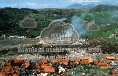 Burning rubbish & vehicles dumped in open site, Scotland, UK