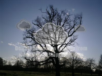 Sun behind large oak tree in winter