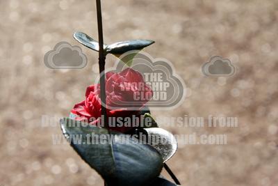 A red camelia flower with a few leaves on a solitary stem