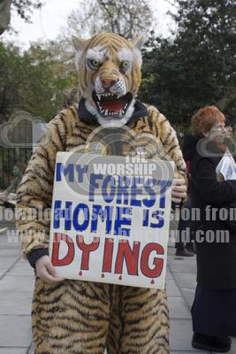 Campaigners in tiger costume protesting against global warming at Climate Change March on December 3 in London, UK