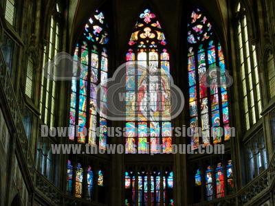 Inside view Cathedral of St Vitus showing close-up of the Stain glass window.