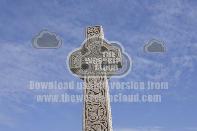 Celtic cross standing out against blue sky with wispy clouds North Berwick Scotland