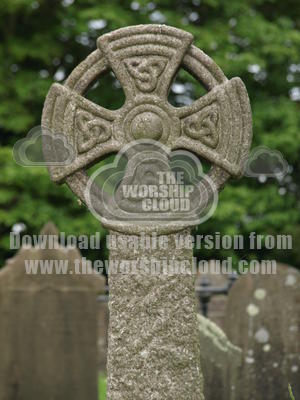 Celtic stone cross grave marker against the background of a graveyard and leafy trees.