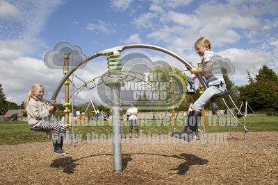 Two girls enjoying hitech seesaw at new exciting playground Broadway Activity Park Worcestershire UK