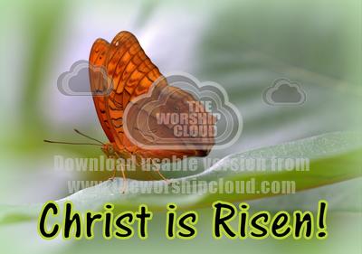 Beautiful butterfly with words Christ is Risen at the bottom. opy space at the side for notices or Bible text