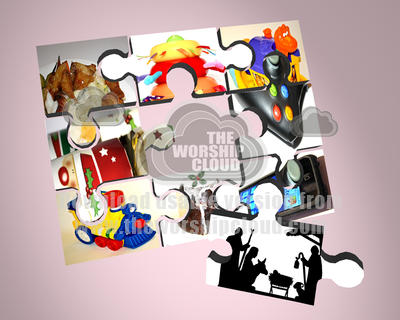 A Jigsaw made up of the commercial images of Christmas with the final piece, the centre piece showing the true meaning of Christmas.