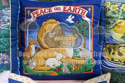 Colourful cushion with lion and lamb headed Peace on Earth on stall at annual Cider Fete, Caudebec-en-Caux on River Seine near Lillebonne, France