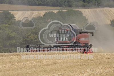 Red combine harvester working in Cotswolds near Winchcombe, UK