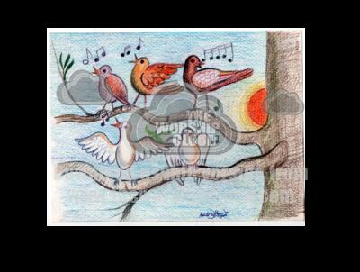 Dawn Chorus drawn by Audrey Hogan with water colour pencils.Comprises of five birds perched on two branches singing.