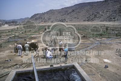 Men laying piping for desert irrigation to grow crops Saudi Arabia