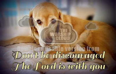 Sad looking dog photo with words underneath. 'Don't be discouraged. the Lord is with you.'