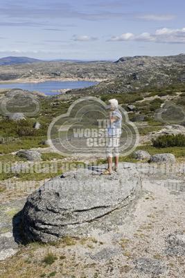 Elderly woman using mobile phone high in mountains Parque Natural da Serra da Estrela on high plateau near Guarda Portugal