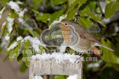 European robin Erithacus rubecula perched on spade handle in snow Woodmancote Cotswolds UK
