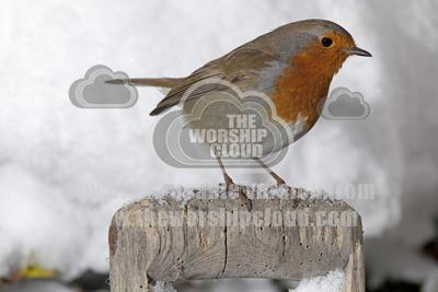 European robin Erithacus rubecula perched on spade handle in snow Woodmancote Cotswolds UK