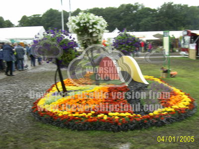 Tatton Park Garden Flower show.Island style flower bed with trees and bridge. Very decorative and imaginative.The wet weather might have destroyed this but the display was even more splended by it's contrasting beauty.Digital photograph by Audrey Hogan