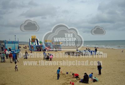 Bournemouth beach in school Easter holidays on a cloudy day.