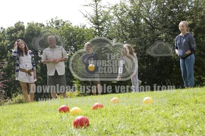 Family playing boule on lawn with coloured plastic balls Cotswol