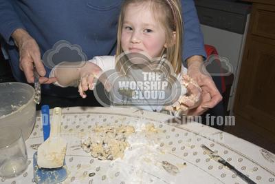 Five-year old Faith with sticky fingers mixing dough to make scones on kitchen table