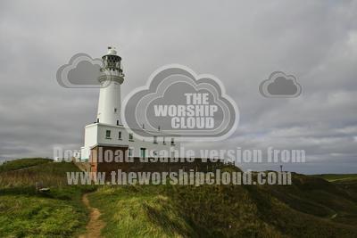 A greyish sky hangs over the gleaming white 'new' lighthouse at Flamborough in Yorkshire.
