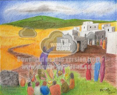 Jesus points to the samaritan village whilst standing near to the well and addressing his disciples who are seated and eating. The backdrop are fields ripe for harvesting.