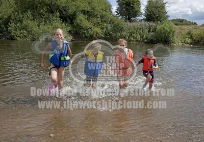 Four children with lifejackets running in River Wye Hoarthwithy