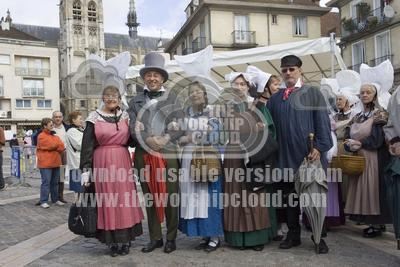 French folk in traditional dress in town square, Cider Fete, Caudebec-en-Caux on River Seine near Lillebonne, France