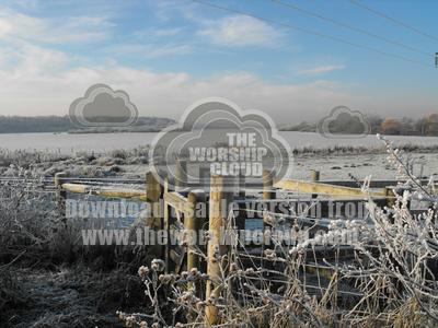 image of Fairburn Ings in deep winter, frozen lake in background with fence and gate in foreground