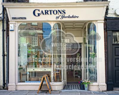 • Fruit and flowers in attractive shop window display, Cotswolds,
