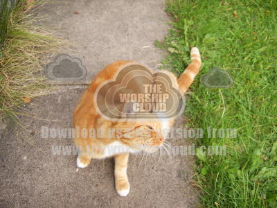 Ginger and white bibbed cat getting up to scratch on the garden path.