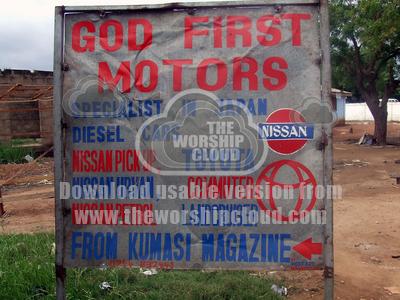 Image of religious slogan: 'God First Motors' advertising a local business in Ofankor, Accra, Ghana, 2007.