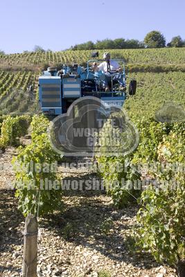 Mechanical grape harvesting by Braud 1620 S machine in late September, Sancerre, France