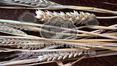 Picture showing grains of wheat still attached to the stalk.