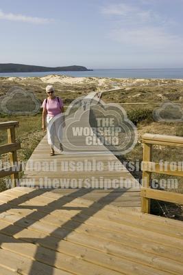 • Couple walking on long boardwalk to beach at Punta Fruxeira near