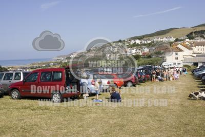 Hundreds of holidaymakers parking cars before spending the day on a crowded sandy beach enjoying hot sunny weathers in August, Woolacombe, Devon, UK