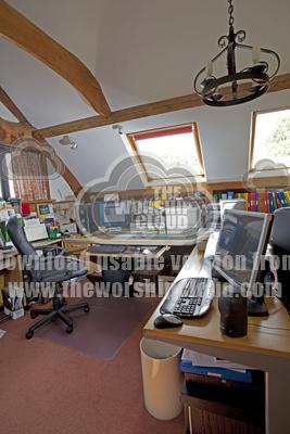 Home based IT computer office above garage in Cotswold house Woodmancote UK