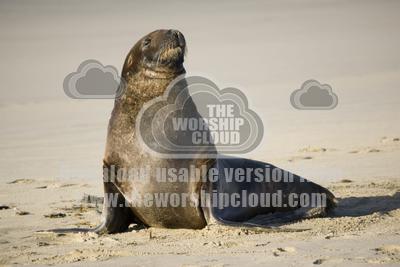 Hookers sea lion Phocarctos hookeri hauled out on beach Serat Bay Catlins South Island New Zealand. This is one of the rarest and most endangered species of sea lions which were hunted for oild and hide until hunting was banned in 1893.